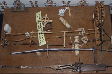As principais peças eram a Roda, toda feita de madeira e que trabalhava num eixo de bronze. Havia 3 rodas, sendo 2 fixas e uma móvel, que usávamos para levar para a zona dos “Varais” (actual rua Amorim Campos), na época das cheias. A roda tinha a altura de um homem. Depois havia o Trabuco, onde encaixavam as manivelas de ferro, que torciam a corda. A Talha, era uma peça onde encaixava o trabuco, que o prendiam, para que este não se soltasse. As Cruzetas ou Alças, era onde pousava o fio e as Muretas por sua vez encaixavam nas cruzetas e ajudavam a torcer o fio. Os Ferretes eram destorcedores onde ficava o seio do fio a torcer. As Estantes, também feitas em madeira, eram a sustentação da roda. Usava-se ainda o Regador, para humedecer e amaciar o fio e o Corno que se usava para olear.